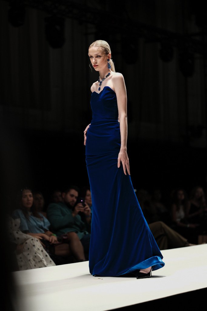 Die Entwürfe bestechen durch mutige Silhouetten, luxuriöse Stoffe und eine royale Farbpalette. Rubinrot, Smaragdgrün, Rubinrot, Violett, Gold, Royalblau und tiefes Schwarz verleihen der Kollektion Ausdruckskraft und königliche Präsenz. Ob samtige Roben, fließende Satin-Kleider oder Kreationen aus schimmernder Seide und aufwendig verzierten Paillettenstoffen. Jedes Modell erzählt eine Geschichte von Luxus, Individualität und Stilbewusstsein. Diana Saroni beschreibt: „Ich wollte Kleider erschaffen, die mehr sind als nur schön. Sie sollen strahlen, fordern und verführen. Und vor allem: Sie sollen nicht vergessen werden.“