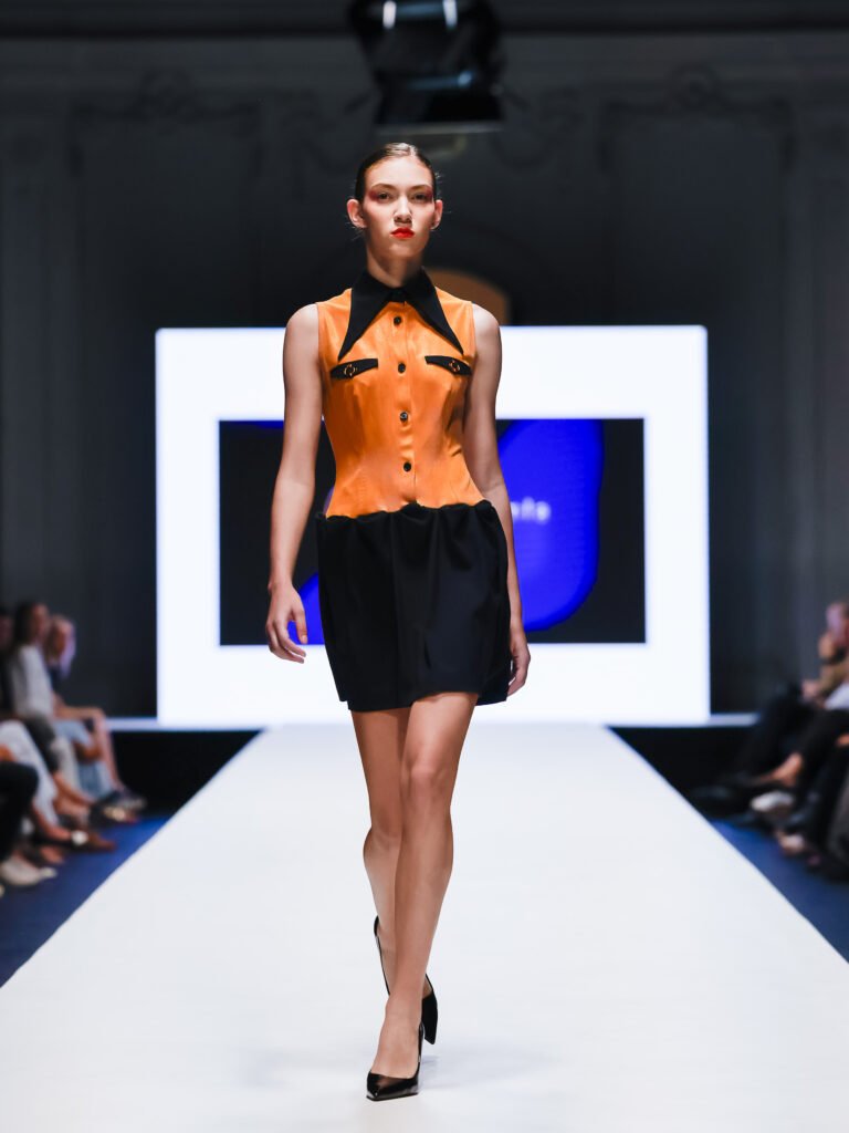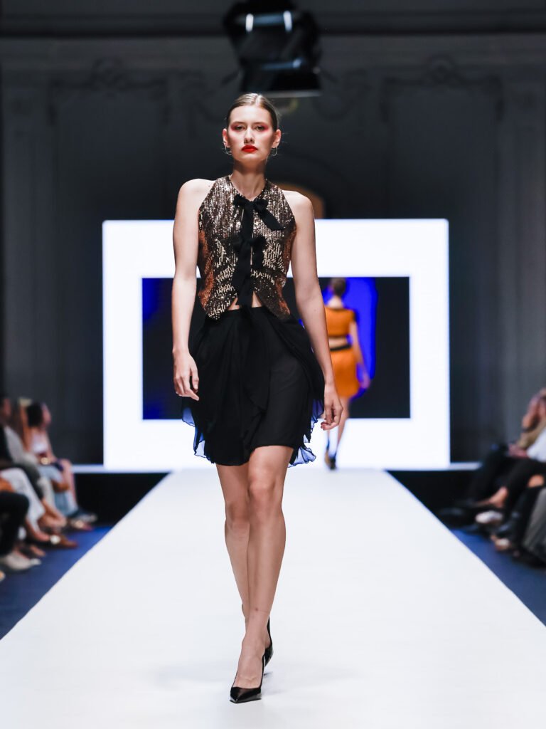 Alicja Semla setzte auf starke Kontraste aus Schwarz und Gelb. Ihre Kollektion überzeugte mit eleganten, zugleich frechen Two-Piece-Kombinationen und Kleidern, bei denen funkelnde Pailletten für glamouröse Akzente sorgten. Jeder Look strahlte Selbstbewusstsein und Verspieltheit zugleich aus.