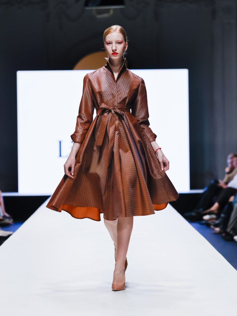 Liudmila präsentierte moderne Eleganz in vielfältigen Facetten, etwa mit einem knielangen mokkafarbenen Mantelkleid, das durch markante Linien, einen hohen Kragen und einen ausgestellten Rock besticht. Ihre Stücke verbinden Schlichtheit, Dynamik und Stärke zu einem harmonischen Gesamtbild.