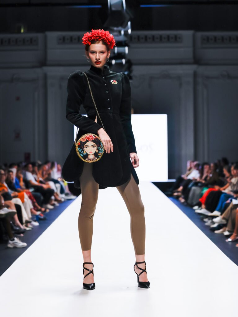 Mrs. Kos präsentierte Mäntel, die wie tragbare Kunstwerke wirken. Vom ausdrucksstarken Schwarz-Weiß-Statement bis zu kunstvollen Einzelstücken. Den krönenden Abschluss bildete eine Hommage an Frida Kahlo – ein kraftvolles Finale voller künstlerischer Tiefe, das Mode und Kunst auf beeindruckende Weise verschmelzen ließ.